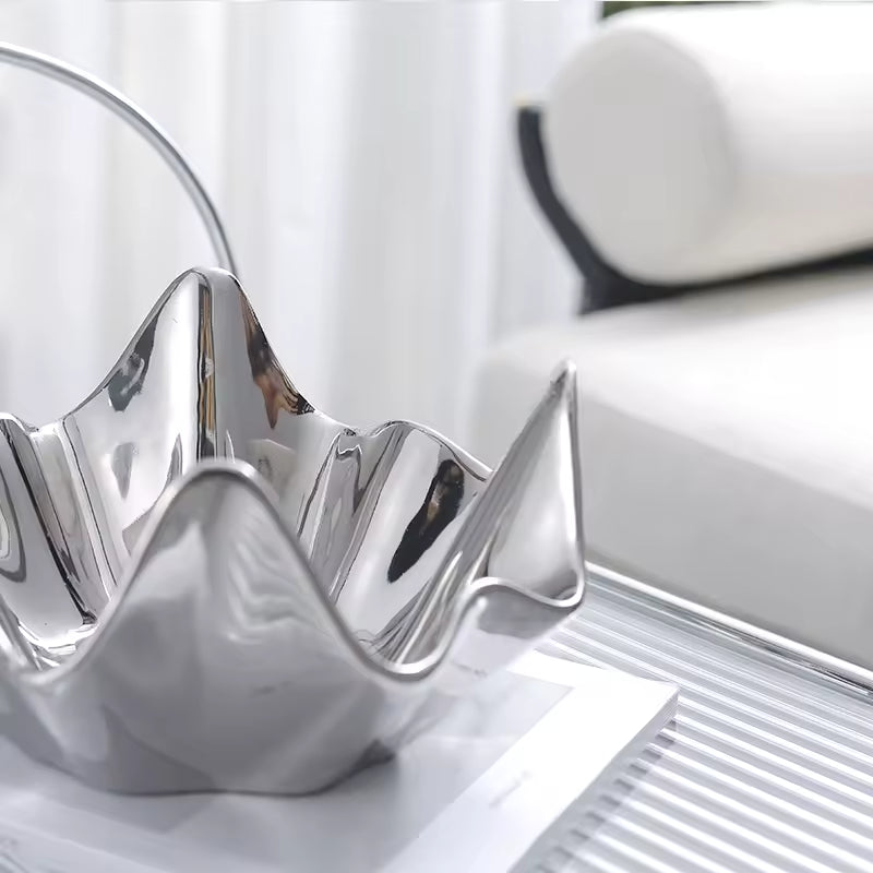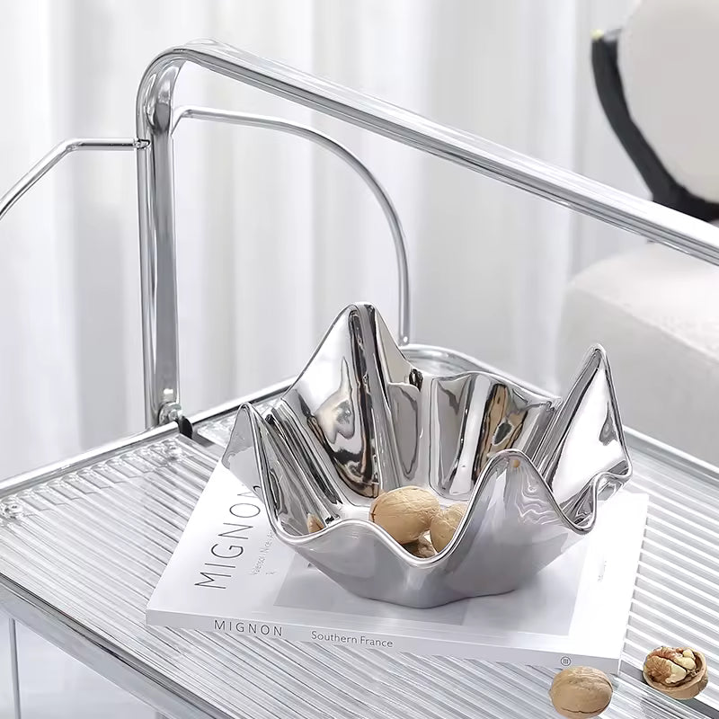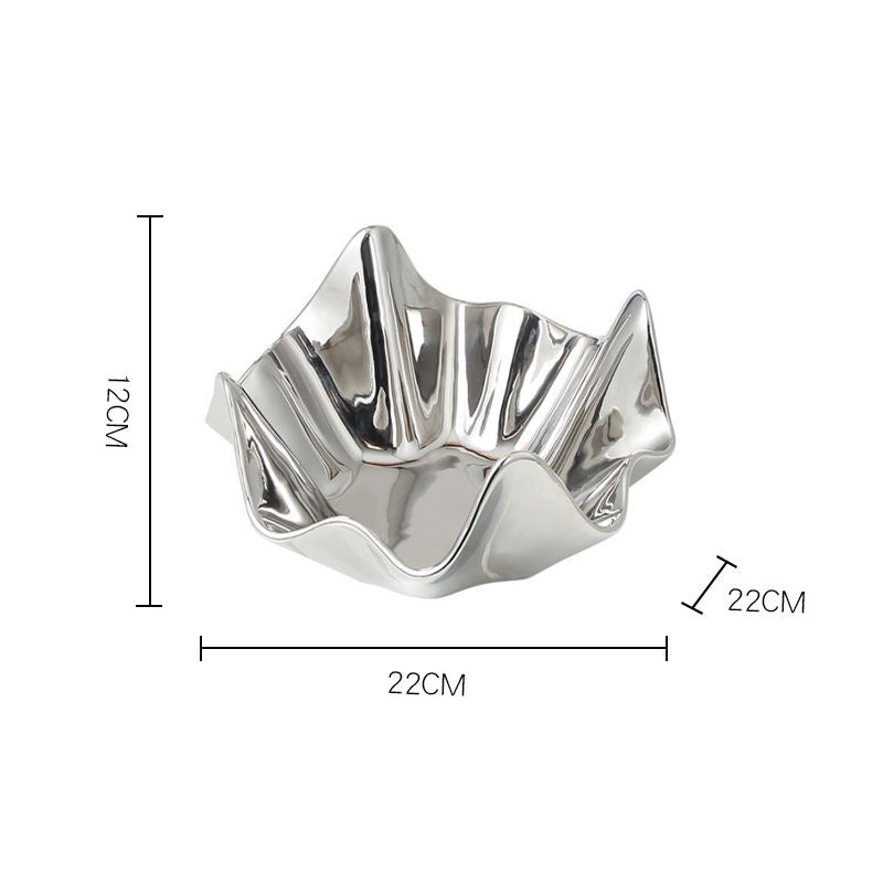 Elevate your interior decor with this stunning modern decorative bowl, featuring a unique wavy design and a sleek metallic finish. Measuring 22cm in width and height, and standing 12cm tall, this eye-catching piece is perfect as a centerpiece for dining tables, coffee tables, or console displays.
